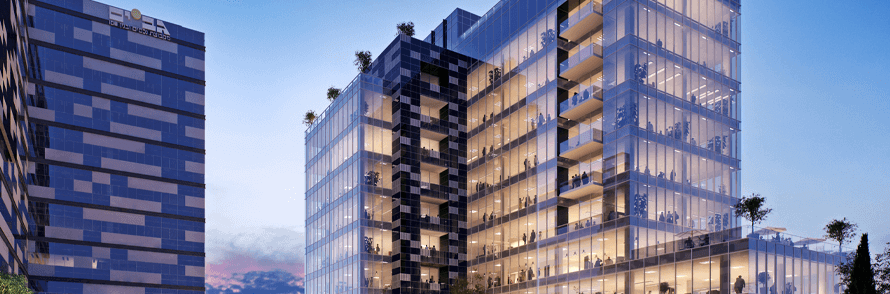 Twelve-story office building. The project has a curtain-wall system of Axtel Matrix 50; typical floor height of 4230 mm (14 ft.); commercial floor height of 6100 mm (20 ft.); Low-E 60T insulation with black insulation glass on office floors; insulation triplex glass on the commercial floor.